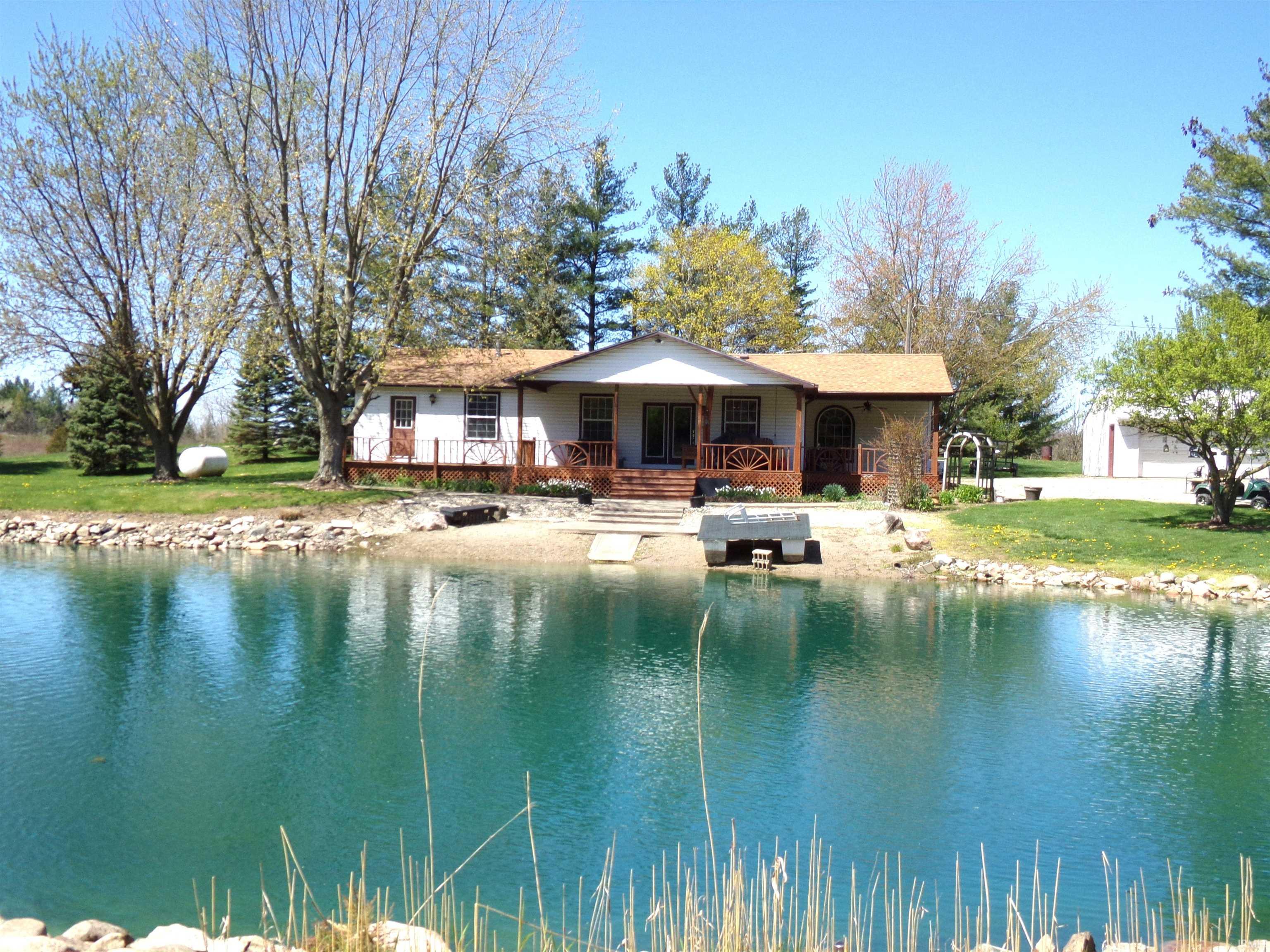 Country home on 5.13 acres with mature trees and pasture ground. This one-story home features beamed vaulted ceiling in the living room; eat-in kitchen with abundance of cabinets; dining room, family room with wood stove, den, 3 bedrooms, 2 baths and a covered porch overlooking a stocked pond. There is a 24x32 garage and 24x32 pole barn. The house has been built around a singlewide mobile home that is in the center of the home. Electric stove, refrigerator, microwave and water softener are included. Porch swing and concrete bench are not included.