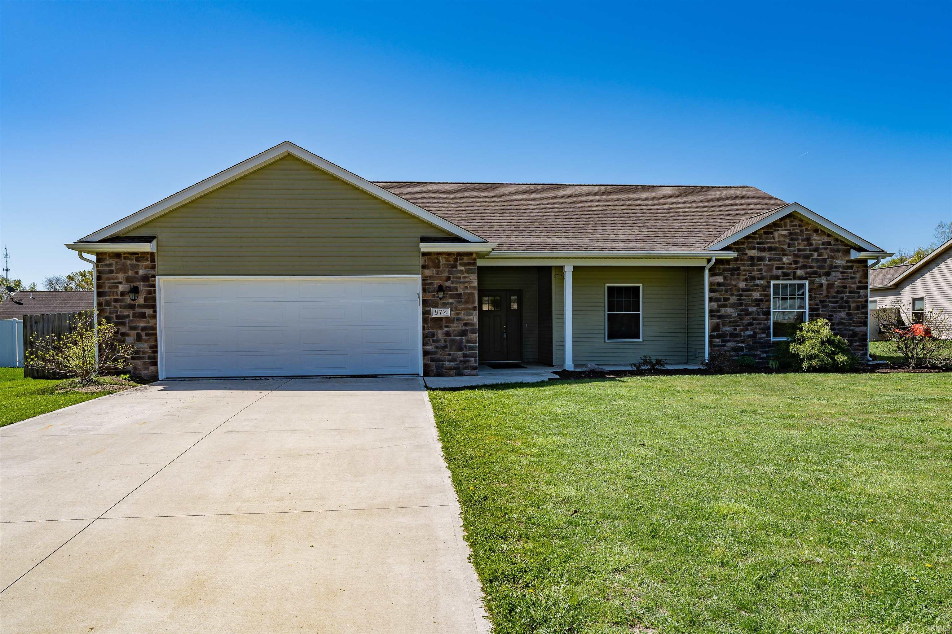 Say hello to this stunning move-in ready custom quality built ranch featuring a generous open concept floor plan with vaulted great room & large fenced back yard—mere minutes from downtown Columbia City! Located in Brennan’s Addition just north of E Jefferson St, in quiet & peaceful area with minimal through traffic, this incredible 3 bedroom, 2 full bath home is sure to charm from moment you arrive! Presenting obvious curb appeal, this 2017 built home has a neat & tidy lawn with select landscaping & flower beds ready for spring planting against a backdrop of stone facade & vinyl. Attached oversized 2.5 garage includes organizers that remain to help store all your tools & toys plus a long covered porch with room to sit & chat with friends. Inside the front door with matching sidelight you’ll find a bright & welcoming atmosphere complemented by 9’ ceilings throughout & a warm neutral color palette (freshly painted this April 2024)—ideal for allowing your own personal style to show through! Wood vinyl flooring in foyer gives way to carpeted main living area with cathedral ceiling, gas log stone fireplace to keep you cozy all winter long & back yard facing windows allowing plenty of natural light. Living is open to eat in kitchen boasting abundant custom Miller cabinets, backsplash, recessed lighting & SS appliances (all remain in the sale). Enjoy meals underneath modern chandelier with a view to back yard from glass door to walk-out 12x12 patio. Laundry off kitchen with garage access & mud room cubbies for coats & shoes. Spacious primary bedroom includes en suite bath with walk-in shower & walk-in closet behind pocket door with build-ins. Remaining 2 bedrooms are both comfortably sized (all have ceiling fans to keep air flowing) with ample storage throughout. Main shared bath has tub/shower combo & hard surface vanity. Big back yard is a huge draw & sure to be a popular gathering point as it's completely enclosed by 6’ wood privacy fence—your own secluded retreat! Patio is excellent for relaxing in the sun or dining al fresco, back yard BBQ’s are on the menu this summer! All kinds of room for outdoor fun & activities, you can even test out your green thumb with gardening. Home has a 95% efficient furnace. Fantastic location practically right next to Morsches Park, the Blue River Trail, YMCA & the hospital. Easy access to nearby shopping, dining & groceries along US 30. Are you ready to have your best summer yet? Don’t let this one slip away—reach out today!