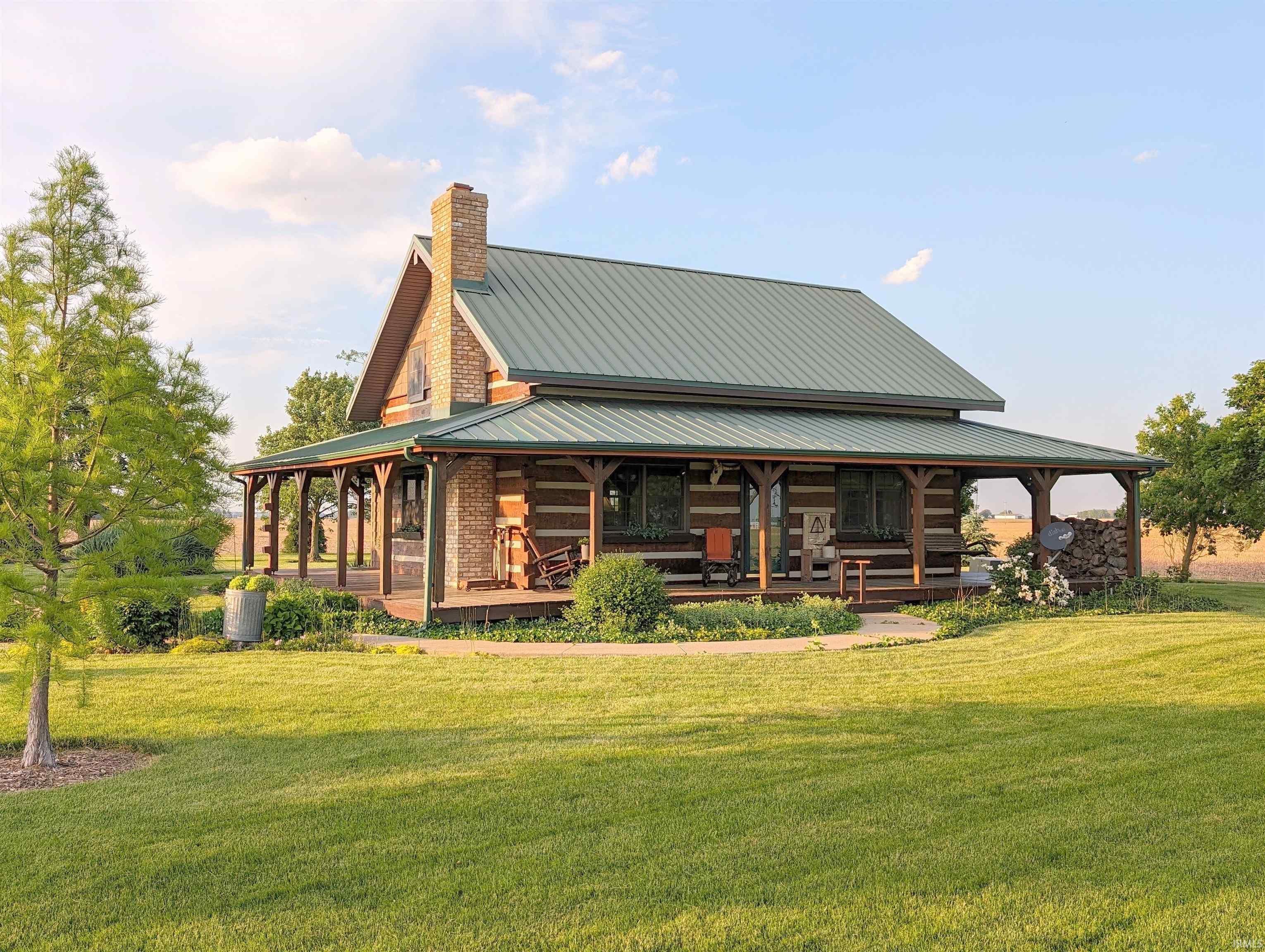 Welcome to your dream log home with tranquil country living and a taste of the lakes. This is where rustic charm meets modern convenience in a picturesque setting. For the size of the home, it offers 3 living areas. Step into the main floor with it's open kitchen with granite countertops, dining area, living room featuring a floor to ceiling brick fireplace, one bedroom, and full bath. Step up to the 20x14 open loft and the 20x11 bedroom. The basement has a 21x17 family room with a gas log fireplace, den or bonus room, and utility room. Next, go outside to the 166' wrap around covered porch and perennial garden flower beds. Enjoy your morning coffee on the porch overlooking the stocked pond. The 2 heated outbuildings/garage are 32x54 and 32x48 with multiple overhead doors. This property is located only 1 mile from the Ouabache State Park. This is your invitation to escape to a serene country life.