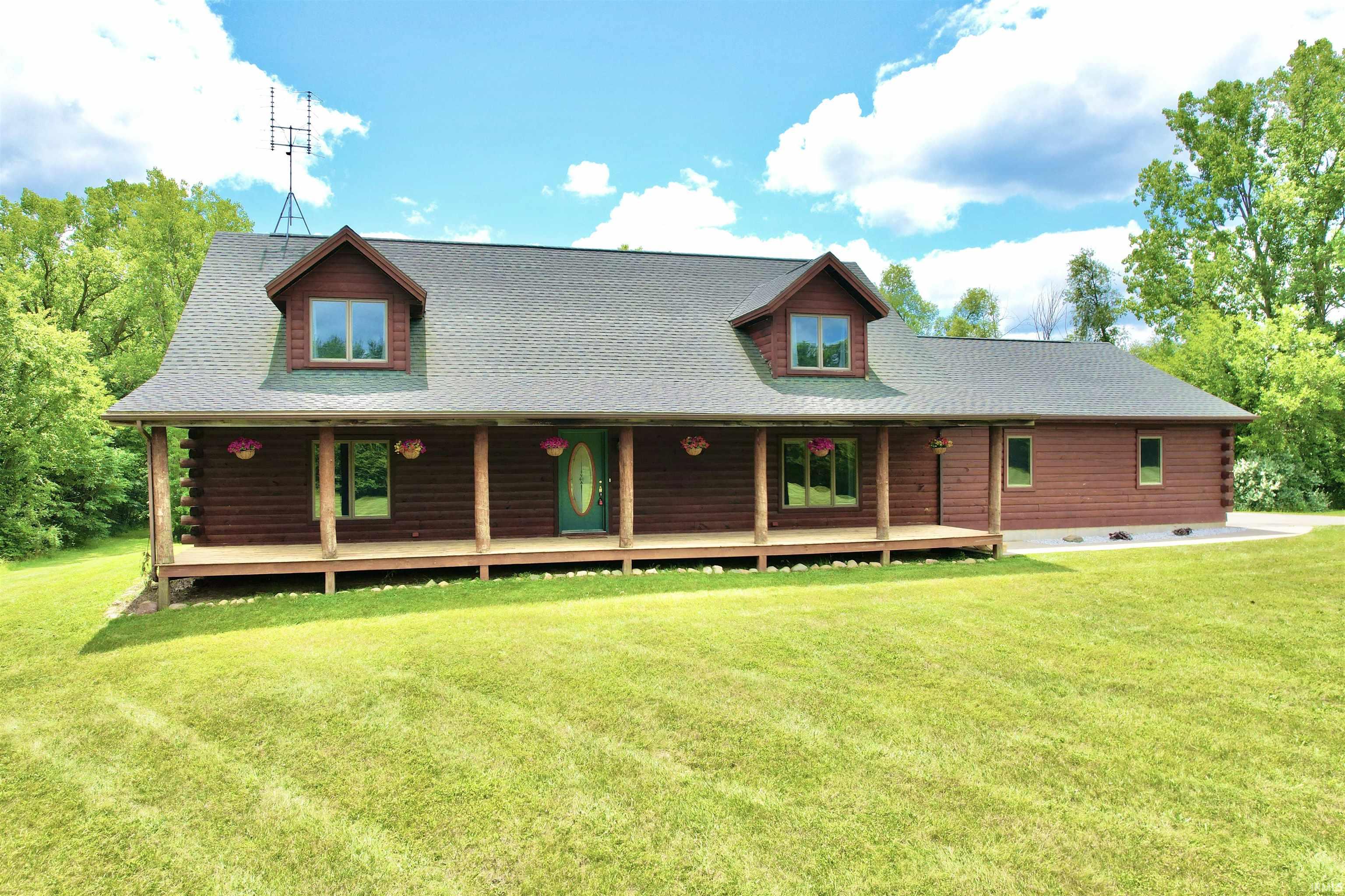 Step into this stunning 4,300+ square foot home and immediately feel the craftsmanship. Loaded with 6 gorgeous bedrooms and 3.5 baths, the home is flooded with natural light, postcard-perfect views, and soaring ceilings. Nestled in an incredible location, it offers natural seclusion and exquisite customization. Energy efficiency is ensured with a geothermal system and highly efficient windows. Relax on one of the massive covered porches or host gatherings in the spacious indoor and outdoor areas of the 10-acre estate. The exterior features a stunning driveway leading to a 1,200 sq. ft. pole barn equipped with water, electric, and a concrete floor. Gently meandering nature trails through woodlands and meadows span the picturesque property, where turkeys, deer, eagles, owls, and blue herons have be seen. A valuable mature mixed hardwood forest borders the eastern side. The newly renovated main bathroom boasts beautiful new luxury vinyl plank flooring and a jacuzzi tub. The living room and master suite have brand new carpets, fresh paint, and a new linen closet. Additionally, the property has a completely new roof on the pole barn (2023) and a new sump pump. Outdoor enthusiasts will appreciate the well-stocked fishing and swimming pond with a dock, and the vast front lawn is perfect for recreational activities. Located just north of Kendallville in Wolcottville, Indiana, this stunning property offers site tranquility while being within 15 minutes of shopping, dining, and local adventures. Please note, some interior photos have been virtually staged.