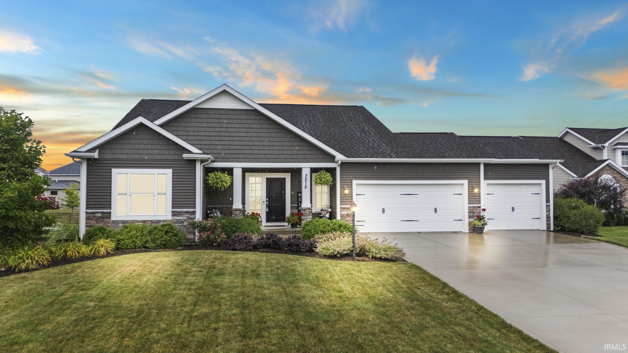 Step inside this absolutely stunning single-story open concept floor plan with a fully finished daylight basement. Our viewers will quickly appreciate that this one-owner home has been well maintained both inside and outside. As you enter the home, you'll be captivated by the expansive 10' ceilings and the open foyer, which displays a gorgeous coffered ceiling and wainscoting detail along the foyer walls. The great room, kitchen, and dining room flow seamlessly together for ease of access and use. The heart of the great room is the fireplace, which features stone accents to the mantle, and the large glass windows that surround the space enhance the beauty of the home while providing an abundance of natural light, along with captivating water views. The kitchen is open to the dining and living room, and exhibits stunning painted white custom cabinetry, providing ample space for storage. The kitchen is anchored by a large island, and all kitchen tops are adorned with granite. The primary bedroom suite is generously sized and displays an added touch of sophistication with decorative crown molding. The adjoining spa-like bathroom features a double vanity with a granite top, private water room, a tile shower, a soaking tub, and an oversized walk-in closet. Bedrooms 2 and 3 are generously sized and contain a private full-size bathroom with a double vanity. As our viewers descend into the fully finished basement, they will appreciate the well-designed layout. There is a 4th bedroom in the basement that is currently used as an office, along with a full bathroom. Additionally, there is a family room, an exercise area, and a large entertainment room with a bar. This is the perfect area to relax and create long-lasting memories with your loved ones. Ascending back upstairs, our viewers can access the covered deck from the dining area. Here, you can enjoy the scenic water views under the shade or descend to the decorative oversized stamped patio where you can grill or relax in the sun. Just off the three-car garage is a large mudroom with a bench and lockers, as well as access to the laundry room. All kitchen appliances, including the washer and dryer, are included in the sale, however, they are not warranted. Owners will be taking the wine fridge in the basement bar and the freezer and fridge in the garage, along with the Ring and cameras. This immaculate home is located in Valencia and is close to shopping, entertainment, restaurants, and I-469.