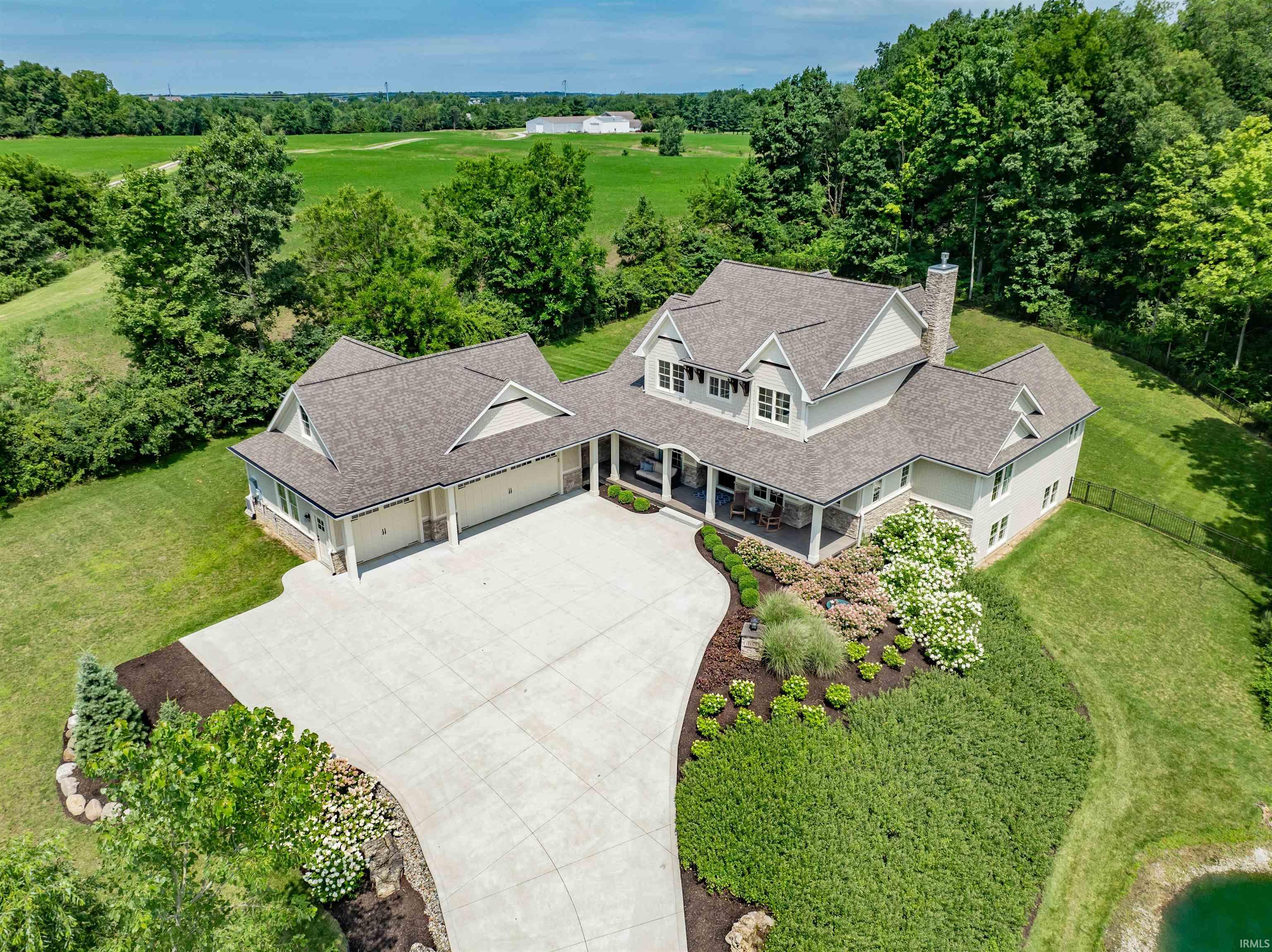 Welcome home to this custom-built stunner by luxury builder Al Hamed in the exclusive Estates on Homestead. Nestled on a serene cul-de-sac with a long private drive, this impressive residence boasts 5,954 square feet of well-appointed living space spread across a daylight basement and situated on a 2-acre lot adjacent to a tranquil pond and surrounded by trees for added privacy. Upon entry you're greeted by hand scraped hardwood floors, exposed beams, and soaring ceilings that create an inviting atmosphere. The grand foyer with built-ins sets the stage for the exceptional craftsmanship and detail throughout the home. The main floor features an open floor plan with an impressive great room w/beamed ceiling & sliders to a covered patio, custom tile fireplace and a wall of windows, which bathes the space in an abundance of natural light. You'll love the versatile sunroom to the back, which is conveniently located next to a former swim spa room with a half bath. The well-equipped kitchen is a dream, featuring a stylish hood, Moroccan tile backsplash, quartz countertops, paneled refrigerator, wall ovens, a gas cooktop, and spacious pantry. Enjoy meals at the sprawling center island or in the charming eat-in area, and host formal dinners in the separate dining room. The bonus mudroom is a standout with a dedicated dog wash area, built-ins, an additional sink, & access to the side yard. Your main floor primary en-suite is a true sanctuary, offering dual water closets, vanities, & walk-in closets, complemented by a stunning tiled shower & a freestanding tub for ultimate relaxation. Upstairs, a loft area provides additional living space alongside 2 bedrooms w/ensuite baths, and walk-in closets. There is also a flex room — perfect as a nursery, craft room, or office. The spacious lower level offers a bedroom, a workout room, a versatile space that could be used as a theater room or playroom, a full bath, and beautiful wet bar. This level also features LVP flooring & a massive storage room with built-in shelving. Additional bonus features of this home include covered front & back porches with wood ceilings and stamped/stained concrete flooring, a 5-bay garage (with 1 bay open to the back for lawn equipment, 3 bays in front, and 1 tandem bay), an invisible fence, and a wrought iron fence. This home is designed with luxury, functionality, & convenience in mind & is perfectly located near walking trails, YMCA, Lutheran, and SACS schools.