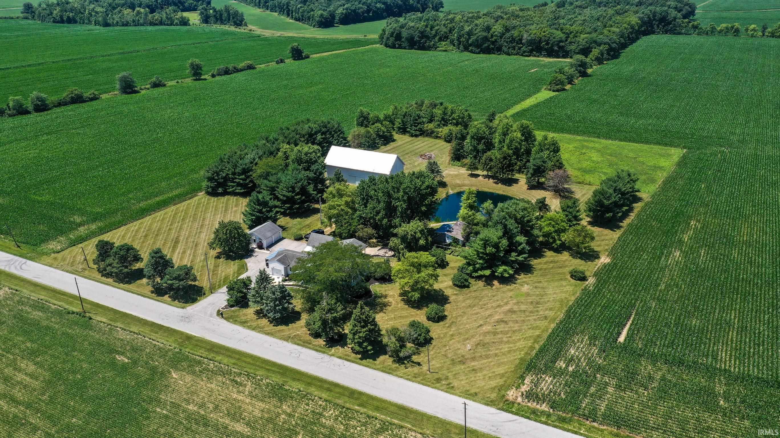 Escape to tranquility with this beautiful 4-bedroom, 2.5 bath home on nearly 6 acres. Discover your dream home surrounded by mature trees and wrapped with miles of farmland. Enjoy a fire, fish the stocked pond, deer watch, stargaze, admire the breathtaking sunsets, shoot pool, or simply relax and watch a movie on the 75” TV in the finished basement. The basement features a custom built-in entertainment center with an electric fireplace and a spare room that could be used for an office or guest space. The outbuildings are a hobbyists dream with endless possibilities. Gather your friends or family in the large kitchen and dining area or spread out into the two living spaces. Fresh paint and carpet through most of the home makes this property completely move-in ready. Schedule your tour today!
