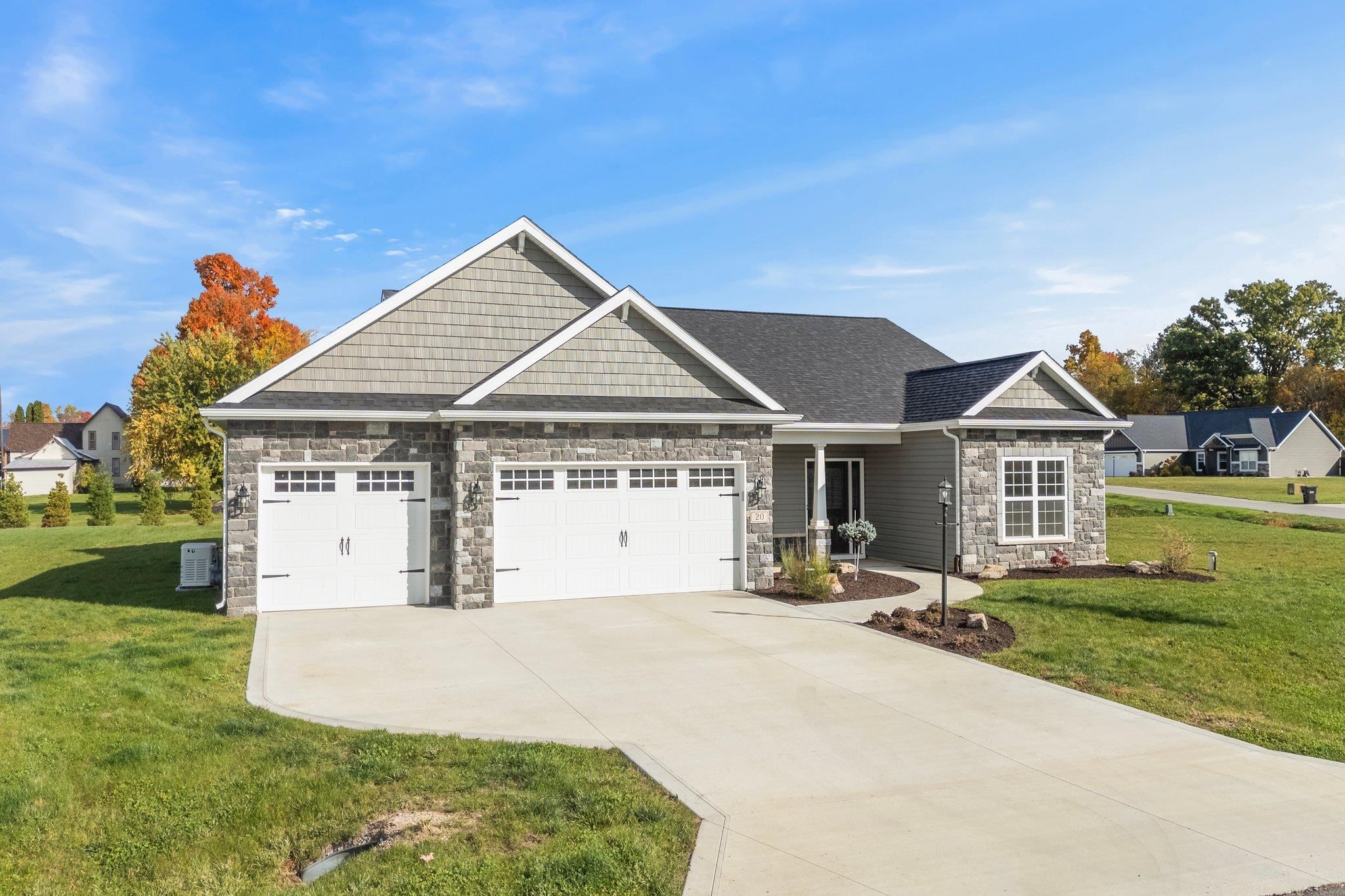 New, quality-built home by Kiracofe Homes. This three-bedroom two bath home sports oversized three bay garage with sunroom and covered porch plus an office. Perfectly designed with room to spare. Located in the new Sycamore Glen subdivision located northwest of Angola, this home comes loaded with features like a 35-year roof, concrete drive, no-care vinyl windows and insulated garage doors. Equipped for low energy costs with Lennox 95% AFUE furnace, 13 SEER central air and high efficiency water heater. Super insulated with a combination of spray foam and batt, R-45 over living areas! No rust fiberglass entry door greets you and the gas log fireplace warms you. All stainless Frigidaire Gallery series appliances, granite countertops and breakfast bar round out the kitchen. Master bedroom suite has walk-in closet, twin sink vanity, separate tub and walk in shower. There's a large sunroom off the rear with covered porches front and rear. Color matched brushed nickel faucets and lighting throughout. Lockers in mud room conveniently found off the garage entry. A must-see home in Angola! Buyer should verify schools, dimensions and other items important to them. Includes whole house generator.