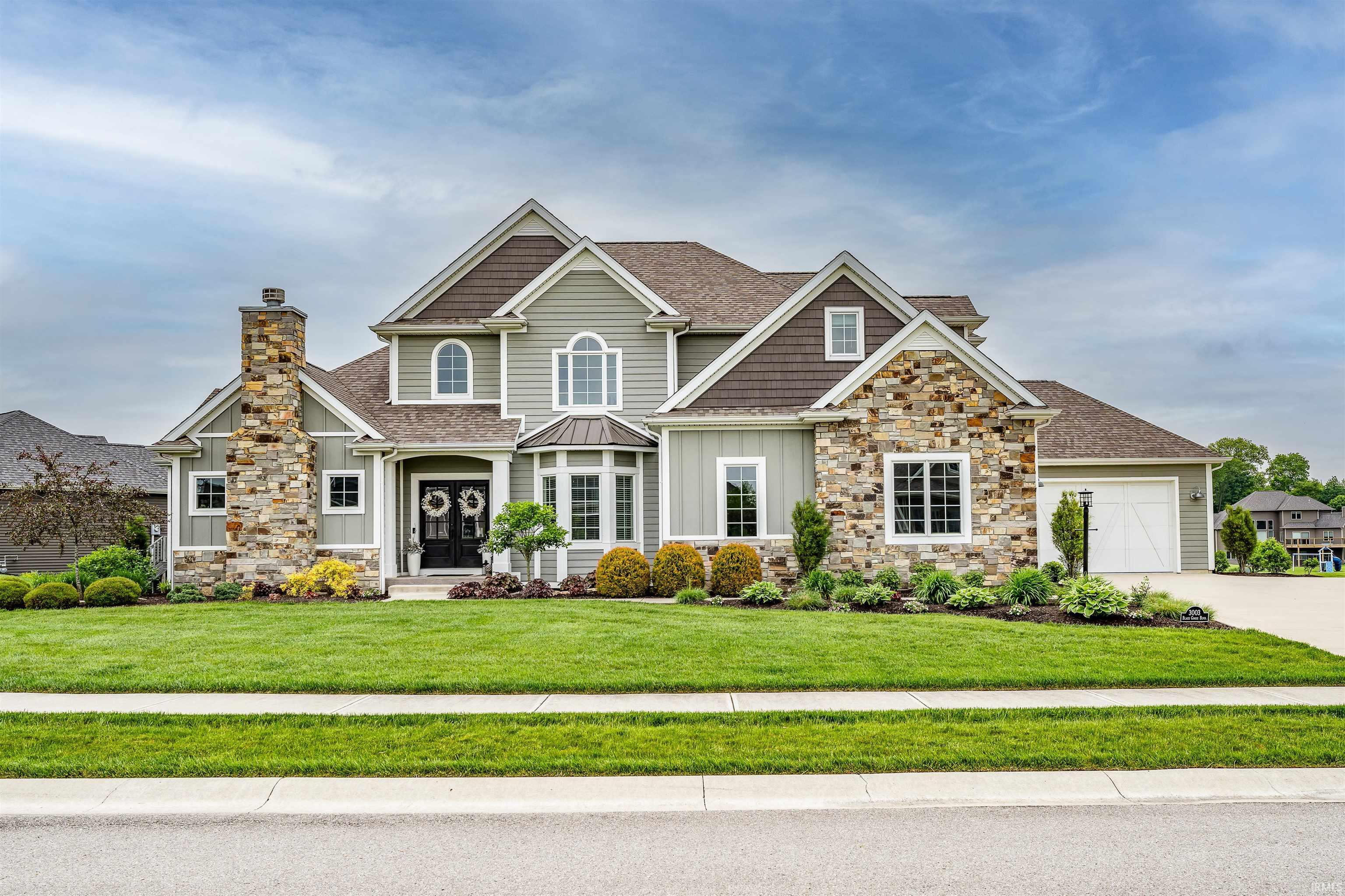 Live your best life in this Timberlin-built show-stopper of a home, offering 5 bedrooms, 4.5 baths, a walk-out lower level, 4-car heated garage, a plethora of storage, signature built-ins, and set against a backdrop of serene water views and lush landscape in the desirable Grey Oaks neighborhood. Upon entering, you're greeted by soaring ceilings, exposed wood beams, hand-scraped hardwood floors, an open staircase, stunning views, large foyer, and soft inviting colors. Step into a private home office/sitting room sanctuary where productivity meets comfort with floor-to-ceiling stone gas fireplace and built-in bookcases/desk. Bathed in natural light, the great room beckons with its rustic charm, boasting a new fireplace, 2-story stacked windows and open to your chef's eat-in kitchen with a grand quartz-topped island, butcher block prep area, and walk-in pantry. Adjacent, the large dining area offers a seamless transition to outdoor enjoyment and entertainment on the 2-tier deck and your backyard oasis. A well situated locker area and spacious laundry room are conveniently located off the kitchen and near the chic guest bath. Retreat to the primary suite under the charm of a ship-lap vaulted ceiling with more built-ins and views. The gracious spa-like en-suite features an oversized garden tub, walk-in tiled shower, dual vanities w/quartz countertops, and private water closet. Upstairs, you'll find three sprawling bedrooms, each boasting its own charm, ensuite bath and ample closet space, ensuring privacy and comfort for all. The walk-out lower level invites entertainment and relaxation with a captivating wet bar, a sizable fifth bedroom w/walk-in closet, a full bath, a home gym, a family room nestled beside a floor-to-ceiling stone fireplace, creating an ambiance of warmth and luxury, and an additional 'rec' space for more seating or games. Outside, the mature, flourishing landscape frames the property, while the tranquil waters of the pond provide a picturesque backdrop. Residents of Grey Oaks enjoy access to an association pool, nearby walking trails and perfectly situated near award-winning schools in Southwest Allen County.