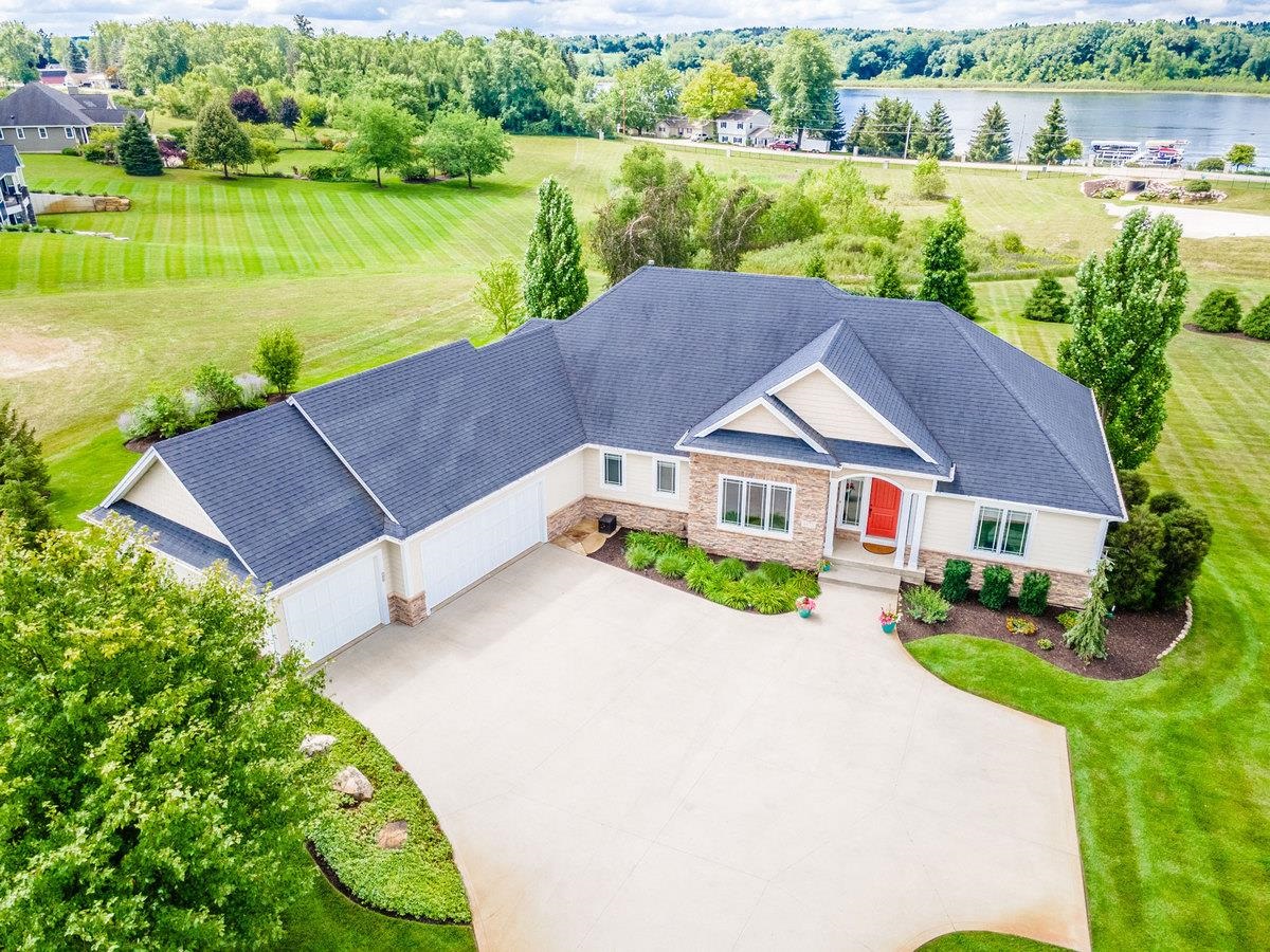 Spectacular lake home with great lake views and access to Crooked Lake. This home will not disappoint and includes 2 backlots with a 2,400 sq ft pole building with a 15' overhead door and the building is plumbed for water.! One level home on a finished walkout basement with a total of 4,878 sq ft. Main level is open concept with crown molding, pillars defining the dining room and a tile foyer entry. Island kitchen features custom cabinetry, a gas fireplace, large breakfast/hearth area, new granite countertops, new copper tile backsplash, newer stainless appliance, tile flooring and access to the lakeside deck. Primary suite is lakeside with a private deck, trey ceiling, twin vanities, jetted tub, walk-in tile shower with 2 shower heads, and a large walk-in closet. All bedroom and linen closets have organizers. The lower level provides lots of areas for entertaining. There is an open concept family room, 2nd kitchen and rec room with access to the lakeside patio including a flagstone patio with fire pit. An additional separate family room with staircase to the garage and slider to a private patio. You'll also find a den, mechanical room, storage room, 4th bedroom and a full bathroom. Crooked Lake Beach Club is a gated, golf cart friendly community with tons of curb appeal including 18 homesite and garage lots, approx. 480' +/- of lakefront, club house with a full kitchen, dining area, 1/2 bath and individual secured lockers for boat and fishing gear and so much more! More details in associated documents.