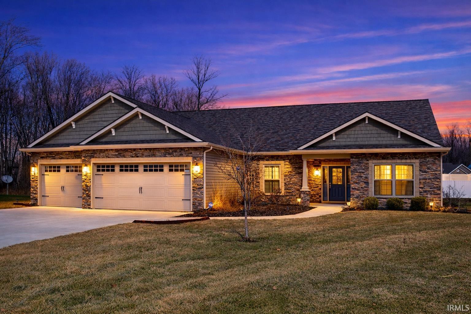 This is Bear Creek Estates. Discover comfort, style, and modern convenience in this well-appointed Majestic Homes Brendon III ranch, offering nearly 2,000 sq ft of thoughtful and functional living space. Nestled on a cul-de-sac lot with peaceful wooded and pond views, this home is designed for everyday enjoyment and effortless entertaining. Step inside to an inviting open-concept great room, enhanced by 9-ft ceilings, a gas-log fireplace, ceiling fan, and windows overlooking the backyard. The adjoining kitchen and dining area is a true centerpiece and a great space for entertaining or daily living featuring a large island with double-basin sink, pendant lighting, stainless steel appliances, tile backsplash, staggered cabinetry with under-cabinet lighting, and both gas and electric options for the range. The spacious primary suite overlooks the serene backyard and includes a well-appointed ensuite with a tiled walk-in shower, kitchen-height double vanity, custom framed mirrors, private water closet, linen storage, and a generous walk-in closet. A standout feature of this home is the converted bedroom into a fully equipped media room, complete with star-light ceiling panels with adjustable colors, pull-down movie screen, blackout curtains, and acoustic tiles, creating the perfect immersive theater experience right at home. This space would make for a relaxing bedroom if not used for a media room. The split-bedroom floorplan provides ideal privacy. Bedrooms 2 and 3 are served by their own dedicated full bath, while the convenient half bath ensures guests never need to enter the private bath areas. Additional features include a versatile den/office with glass French doors, Phillips Hue smart lighting throughout, and a 3-car garage with insulated doors, windows, carriage hardware, and a pull-down attic for added storage. Exterior features include 35-year shingles, Boral stone and vinyl cedar shake accents, and a spacious 28' x 14' patio with privacy panels, perfect for relaxation or entertaining. Enjoy quick access to local parks, trails, boutique shopping, dining, golf courses, and the renowned Auburn Cord Duesenberg Automobile Museum. Its close proximity to I-69 makes commuting simple while maintaining a wonderful balance of comfort and connectivity. Come see why this house should be your next Home!