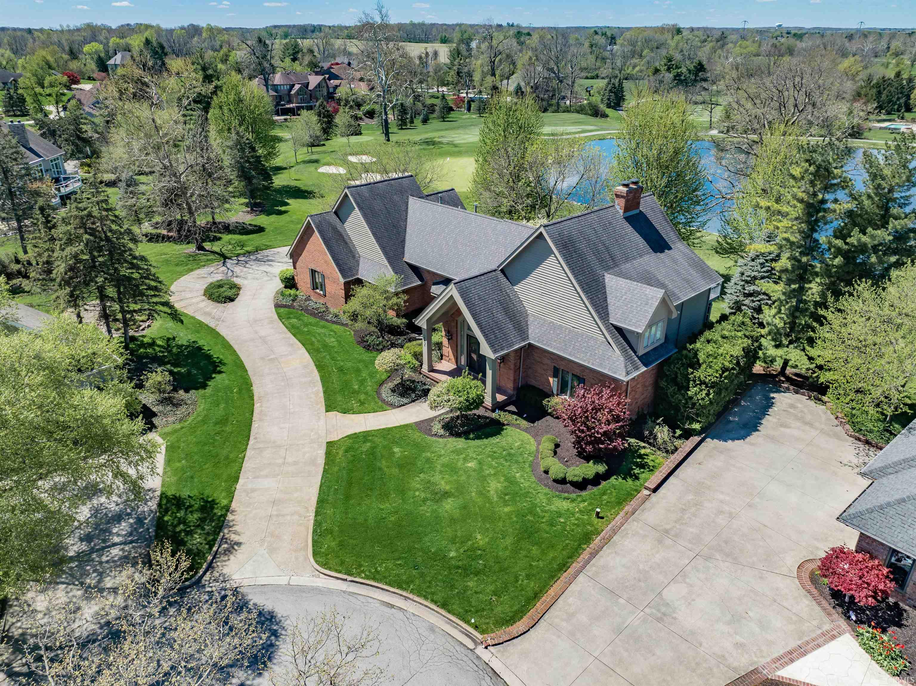 Welcome home to this exceptional villa, defined by its lineage and architectural presence, thoughtfully built by Joe Sullivan and designed by Roy McNett. Privately positioned at the end of a cul-de-sac, it sits near the signature 7th hole in the prestigious Sycamore Hills and provides rare sweeping water and green views. Brick and cedar create a grounded, timeless exterior, softened by two elevated Trex decks and a brick patio tucked just off the office/den, all positioned to take in the changing light across the water. Inside, the entry makes an immediate impression with a two-story foyer finished in porcelain tile and a gracefully winding staircase. The main living space rises to meet a wall of windows, drawing in expansive views and natural light, while opening to a formal dining room detailed with a coffered ceiling and custom built-ins that feel both tailored and inviting. Throughout the home, millwork is deliberate and refined, with storage integrated in ways that feel effortless. The main level office is a destination of its own, framed by ceiling beams, anchored by a gas fireplace, and lined with richly finished built-ins and a hidden built-in bar. A full bath and direct access to the pergola-covered brick patio create the flexibility for this space to transition into a main level primary suite if desired. The kitchen is designed for gathering, with granite surfaces, a generous eat-in area, and seamless connection to a four-season room wrapped in glass with access to the deck. Views remain constant here, shifting with the seasons and time of day. A combined laundry and half bath completes the main level. Upstairs, three bedrooms are arranged with privacy and connection. The primary suite opens to its own deck overlooking the water and includes a bath with jetted tub and separate shower. Two additional bedrooms share a Jack and Jill bath, one with its own walk-out deck. The lower level offers scale and opportunity, partially finished with bonus family room and a home gym, alongside a substantial storage area future expansion. Recent improvements include Marvin windows along the rear of the living room, exterior paint completed in 2025, updated and rebuilt decking with Trex materials, and a roof just a few years old. Mechanical systems have been consistently maintained, reflecting the level of care carried throughout the home. This exceptional villa offers the privacy of a single family home with the benefits of maintenance free living.